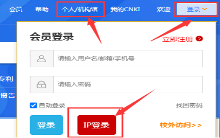 访问中国知网后,个人/机构馆出会显示学校名称,如未显示,请点击登录按钮-IP登录即可。