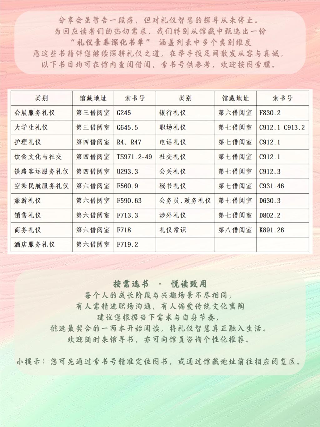 主讲人特别提醒,本次分享会所呈现的礼仪知识,只是礼仪之海中的“星星点点”。从着装搭配到言谈举止,礼仪的学问博大精深、因时因势而变。希望同学们以此次活动为起点,结合自身实际需要,通过持续阅读进行深度拓展与自我修炼。“共读·共谈·共荐”的形式,正是希望营造相互激励、共同成长的阅读氛围,让礼仪的种子在交流中生根,在阅读中开花。